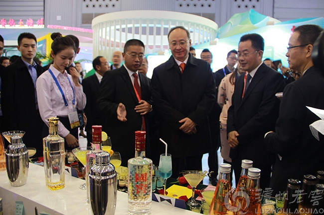 西博會現(xiàn)場,瀘州老窖股份有限公司副總經(jīng)理王洪波(前排左一)向四川省省長尹力(前排左二)和瀘州市人民政府市長劉強(前排右二)介紹瀘州老窖雞尾酒